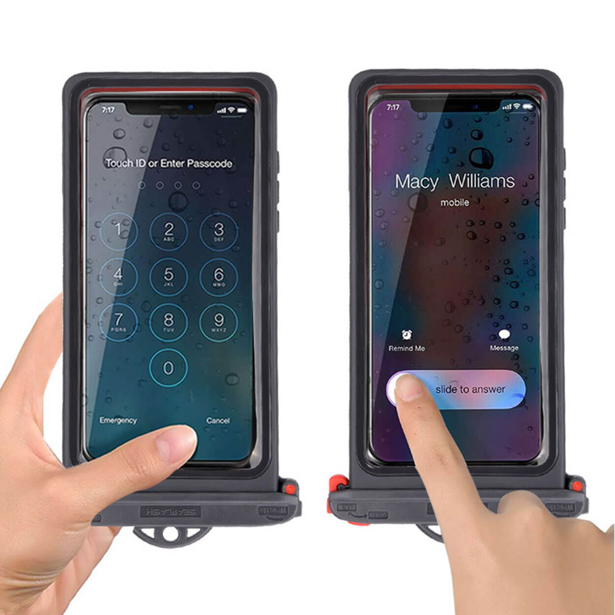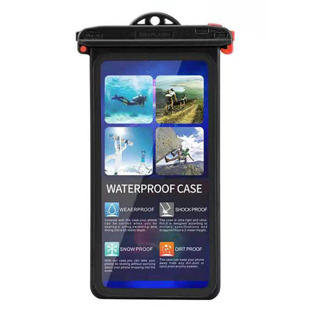 Vattentätt mobilfodral som skyddar smartphone och andra små värdesaker vid bad, strand och regn. Telefonen kan användas medan den ligger i fodralet, vilket gör det enkelt att hantera samtal och appar utan att ta ut den. Universell storlek passar de flesta mobiler upp till 6,9 tum, exempelvis iPhone 11 Pro och Samsung Galaxy S20. Medföljande rem gör att fodralet kan bäras runt halsen eller över axeln. Utrymmet fungerar även för kort, pengar eller pass när du vill ha allt samlat och skyddat.
