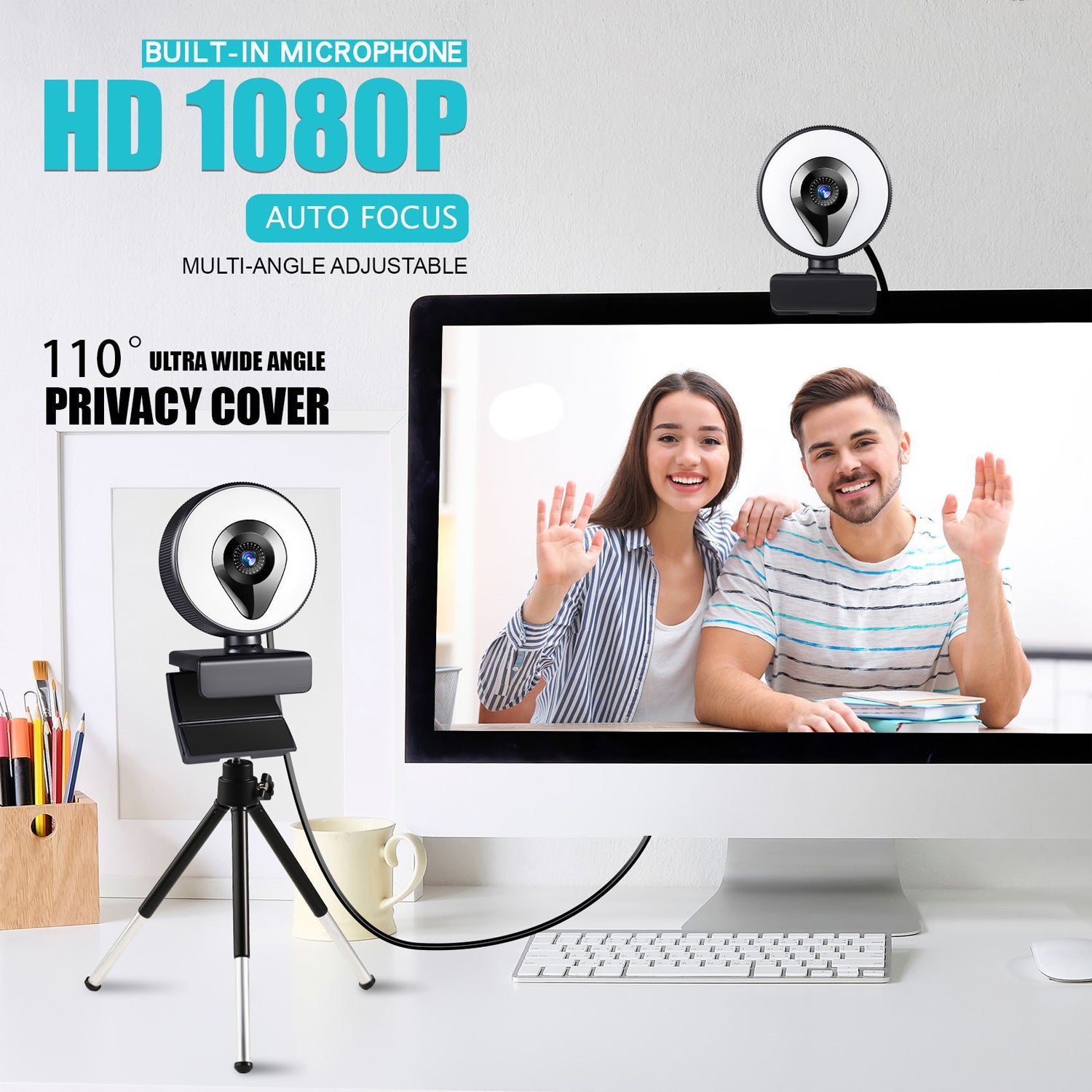 Webbkamera streamingkamera 1080P med mikrofon och ringljus